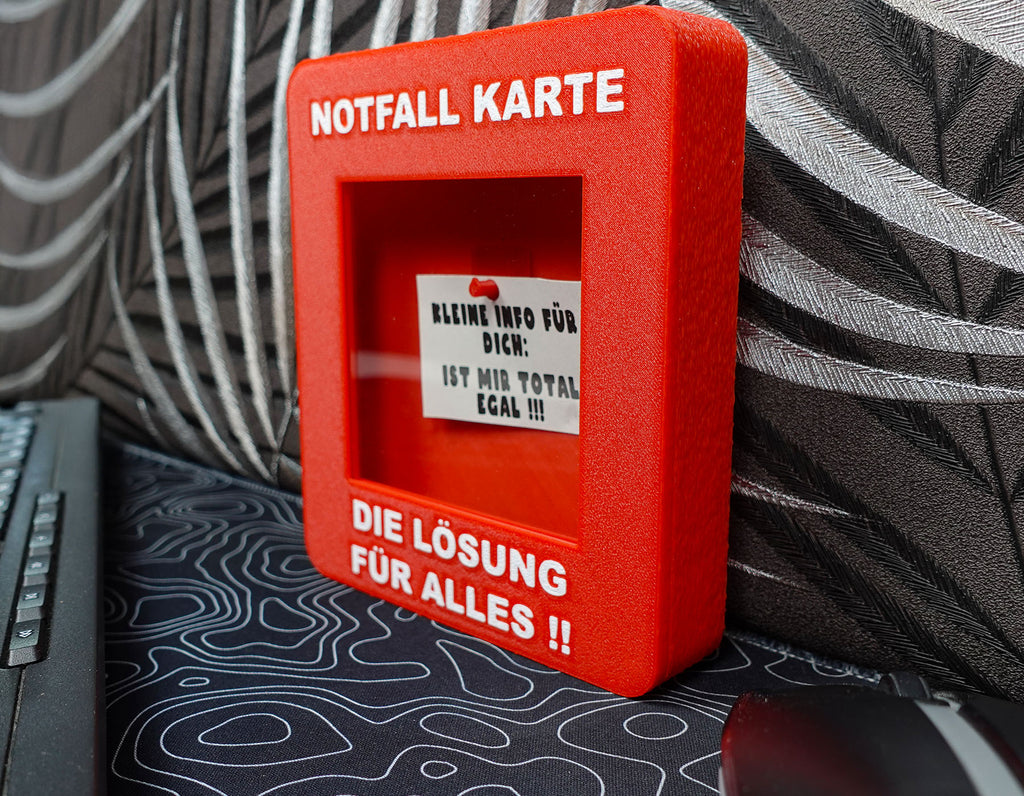 Die knallrote NotfallBox „Notfall Karte – Die Lösung für alles!!“ bringt Ruhe, wenn andere sich zu wichtig nehmen – oder einfach mal wieder ein unnötiges Fass aufmachen.