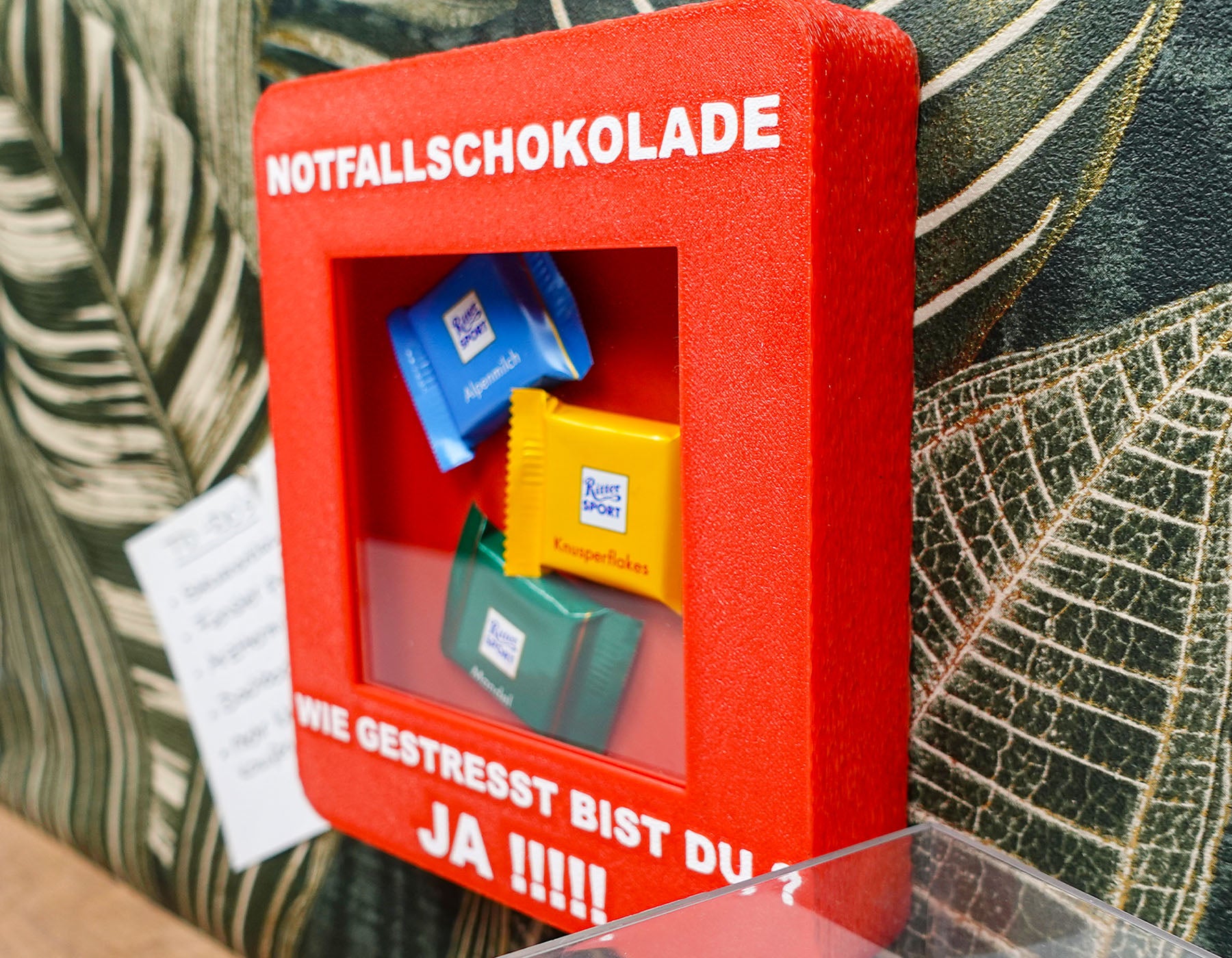 Beschriftung: „NOTFALLSCHOKOLADE - WIE GESTRESST BIST DU ? JA !!!!!“